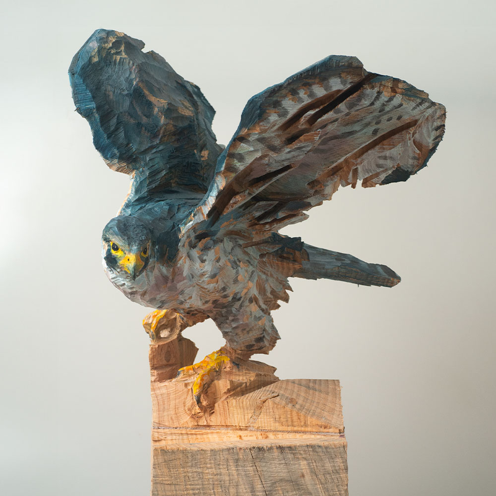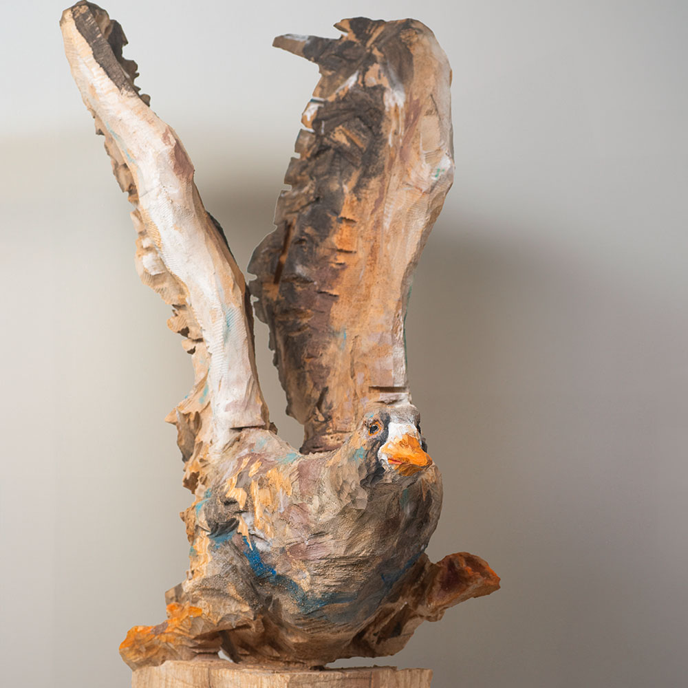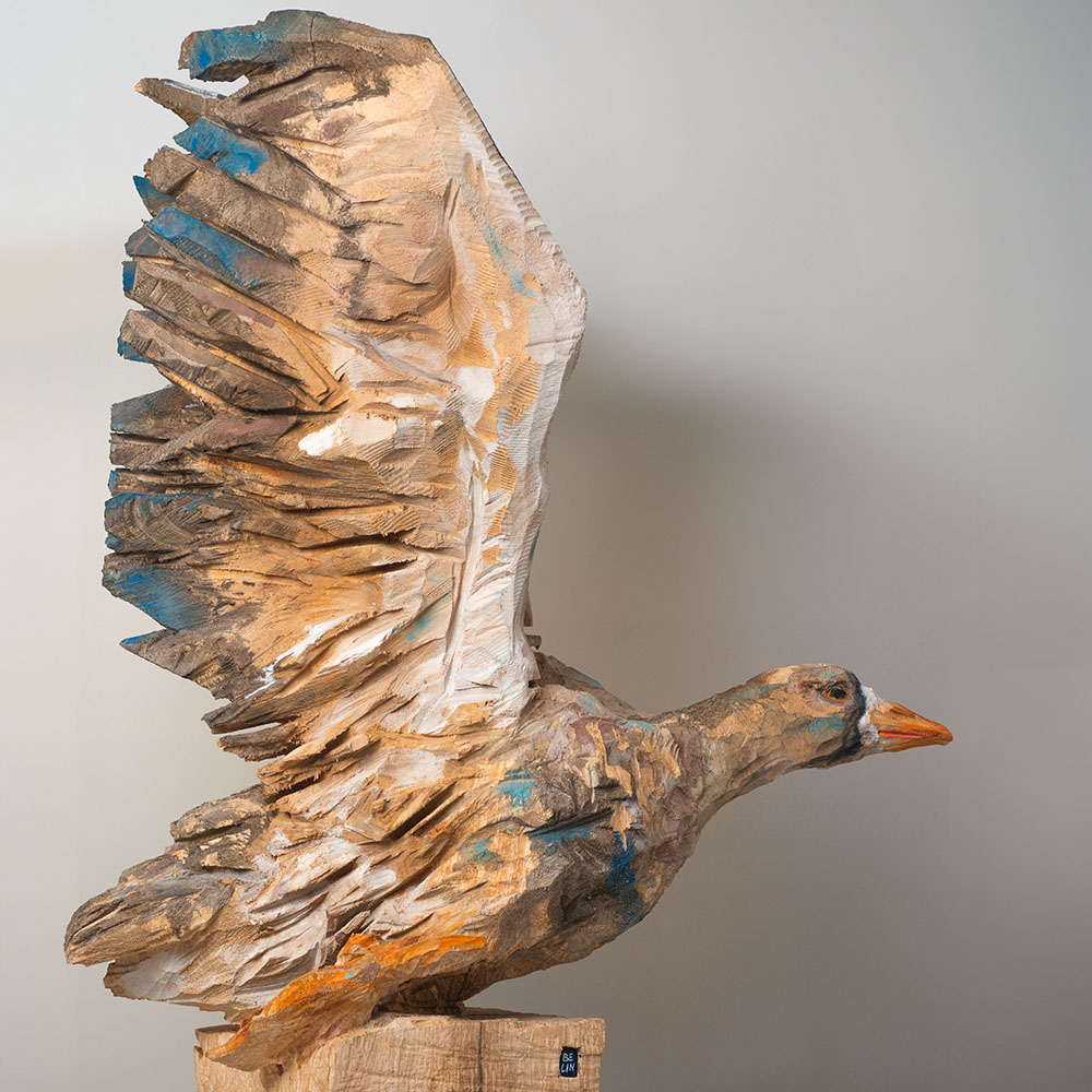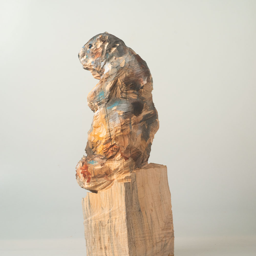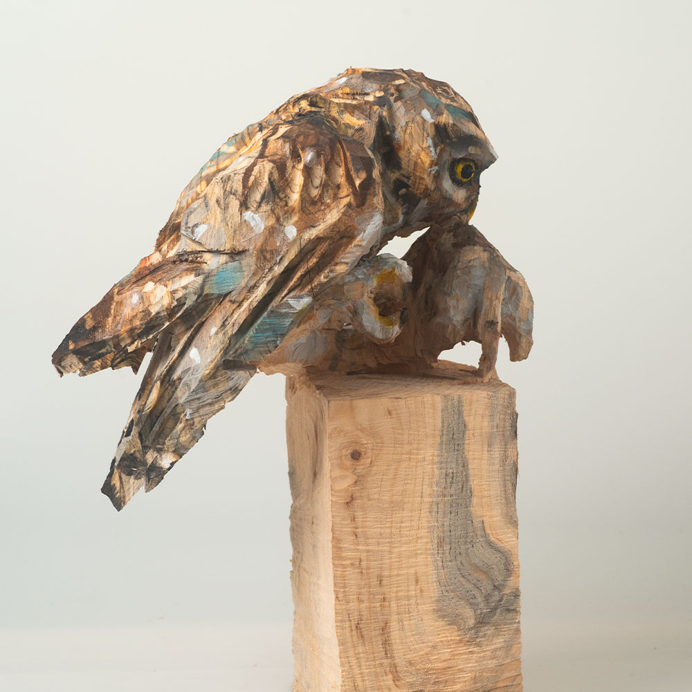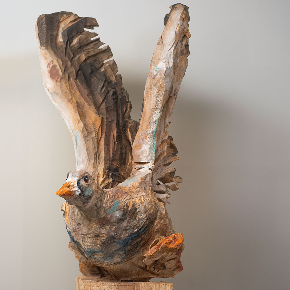 Passionné par la faune depuis toujours, je me suis lancé le défi de sculpter les animaux qui m’entourent, avec l’envie de montrer qu’ils sont tous extraordinaires, même ceux que l’on ne remarque plus. C’est une véritable reconnexion avec mes valeurs et mon environnement. Chaque sculpture est taillée dans un seul bloc de bois. La tronçonneuse, pour moi, est un outil qui permet de capturer l’essentiel, sans s’enliser dans les détails. Cette technique laisse la matière brute, donnant une place à l’imaginaire. Avec mon approche de la peinture, j’utilise des pigments naturels des Ocres du Roussillon pour faire ressortir la vie.