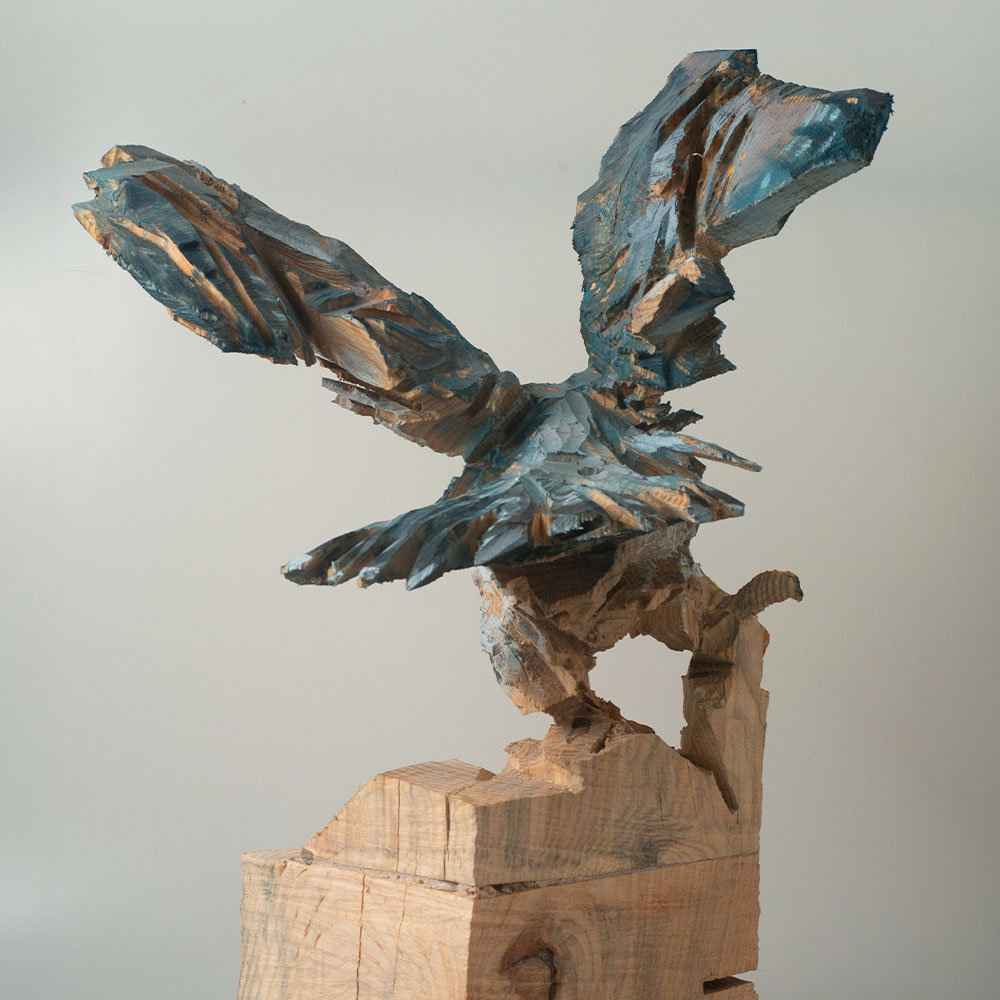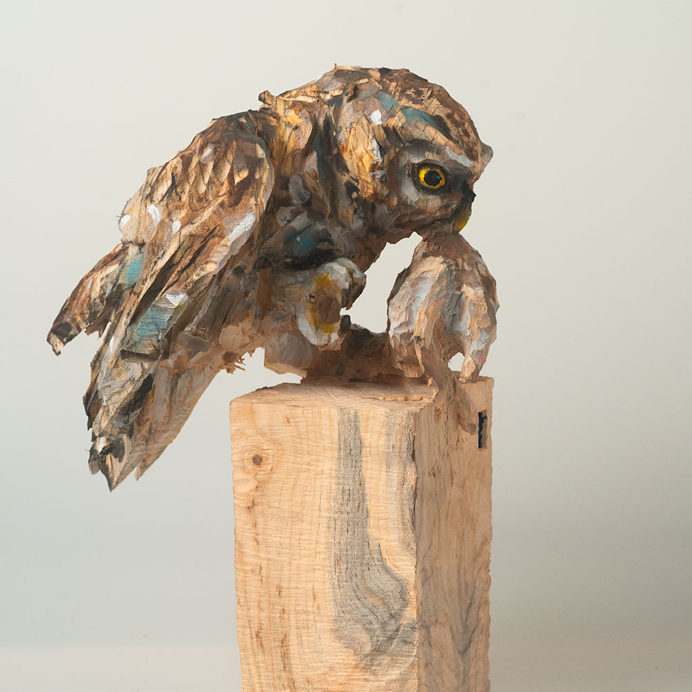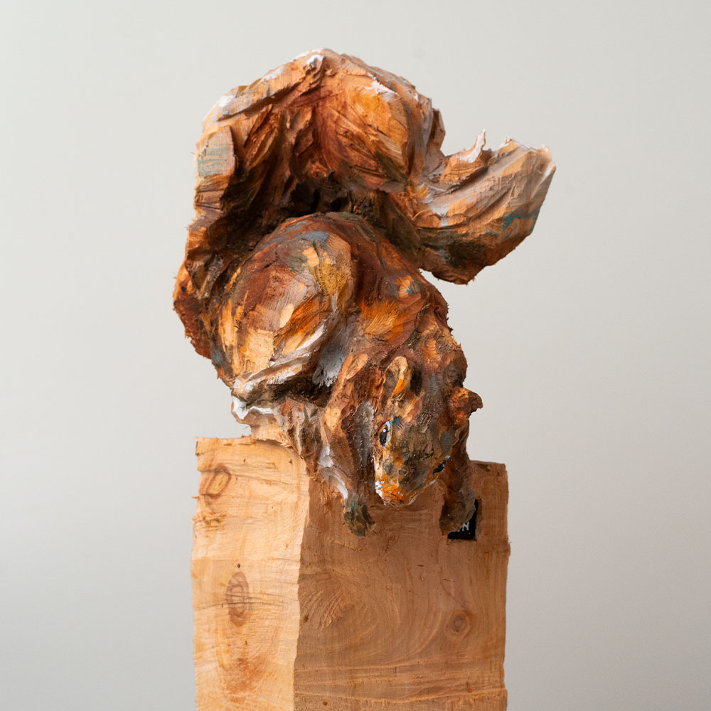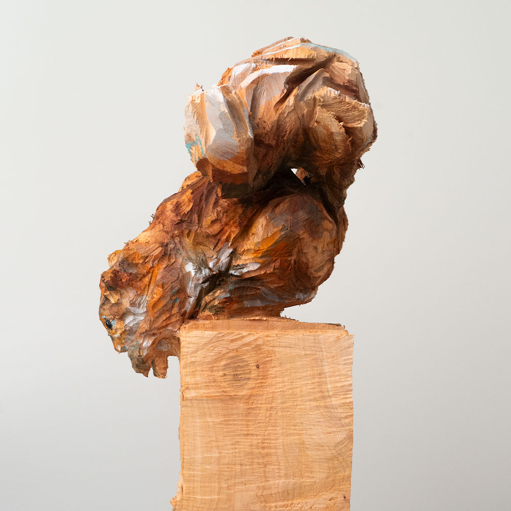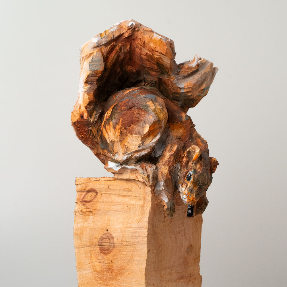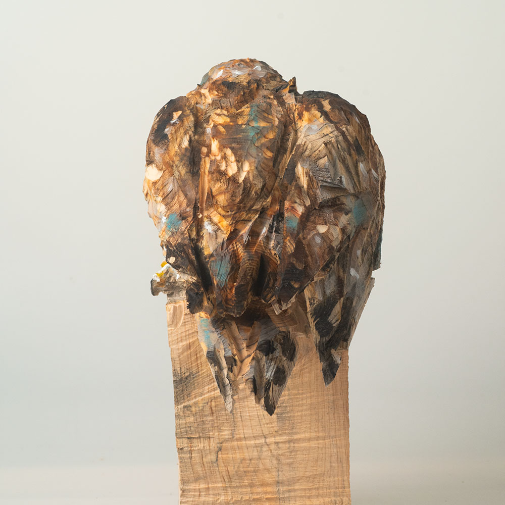 Passionné par la faune depuis toujours, je me suis lancé le défi de sculpter les animaux qui m’entourent, avec l’envie de montrer qu’ils sont tous extraordinaires, même ceux que l’on ne remarque plus. C’est une véritable reconnexion avec mes valeurs et mon environnement. Chaque sculpture est taillée dans un seul bloc de bois. La tronçonneuse, pour moi, est un outil qui permet de capturer l’essentiel, sans s’enliser dans les détails. Cette technique laisse la matière brute, donnant une place à l’imaginaire. Avec mon approche de la peinture, j’utilise des pigments naturels des Ocres du Roussillon pour faire ressortir la vie.