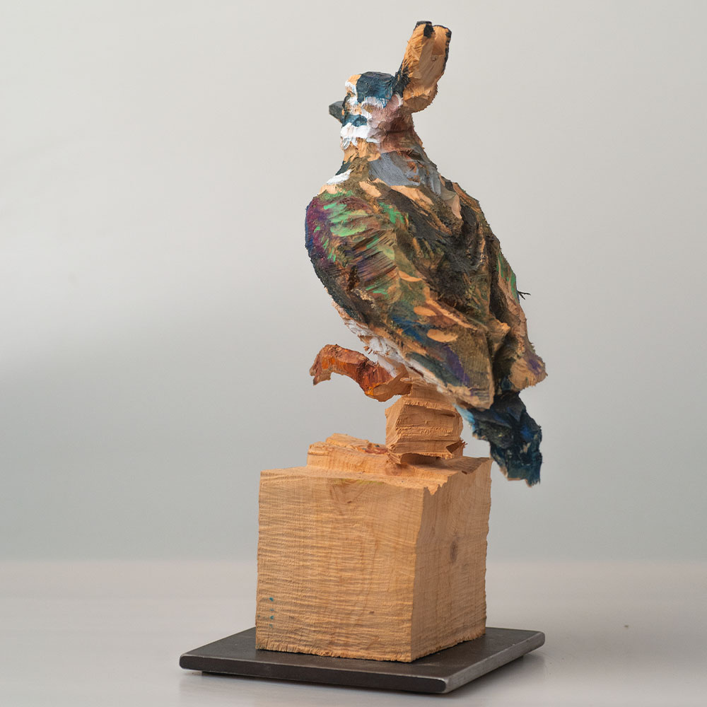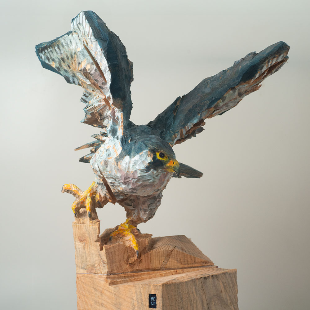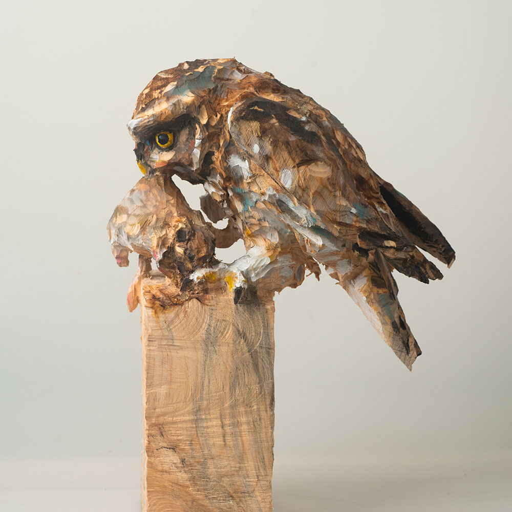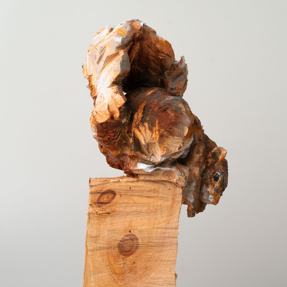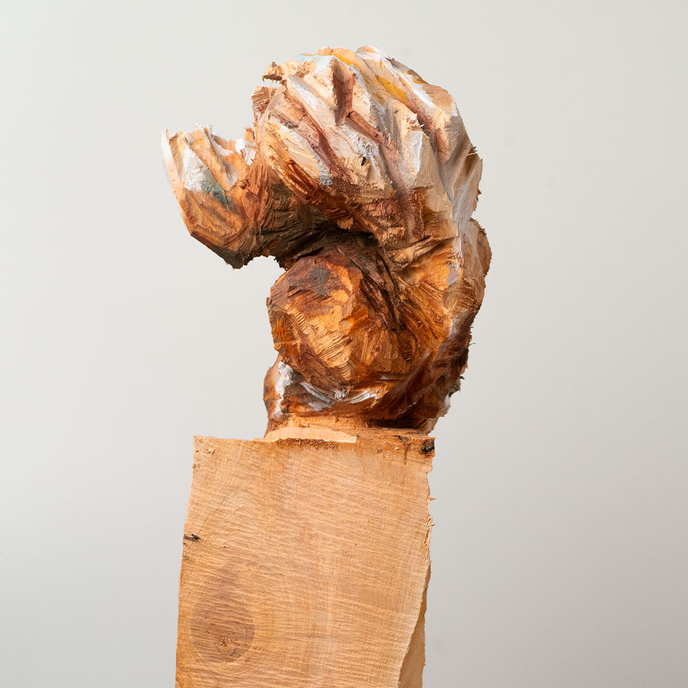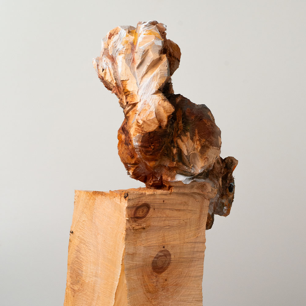 Passionné par la faune depuis toujours, je me suis lancé le défi de sculpter les animaux qui m’entourent, avec l’envie de montrer qu’ils sont tous extraordinaires, même ceux que l’on ne remarque plus. C’est une véritable reconnexion avec mes valeurs et mon environnement. Chaque sculpture est taillée dans un seul bloc de bois. La tronçonneuse, pour moi, est un outil qui permet de capturer l’essentiel, sans s’enliser dans les détails. Cette technique laisse la matière brute, donnant une place à l’imaginaire. Avec mon approche de la peinture, j’utilise des pigments naturels des Ocres du Roussillon pour faire ressortir la vie.