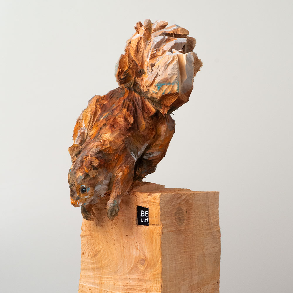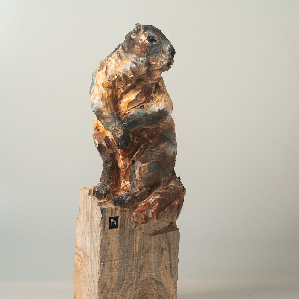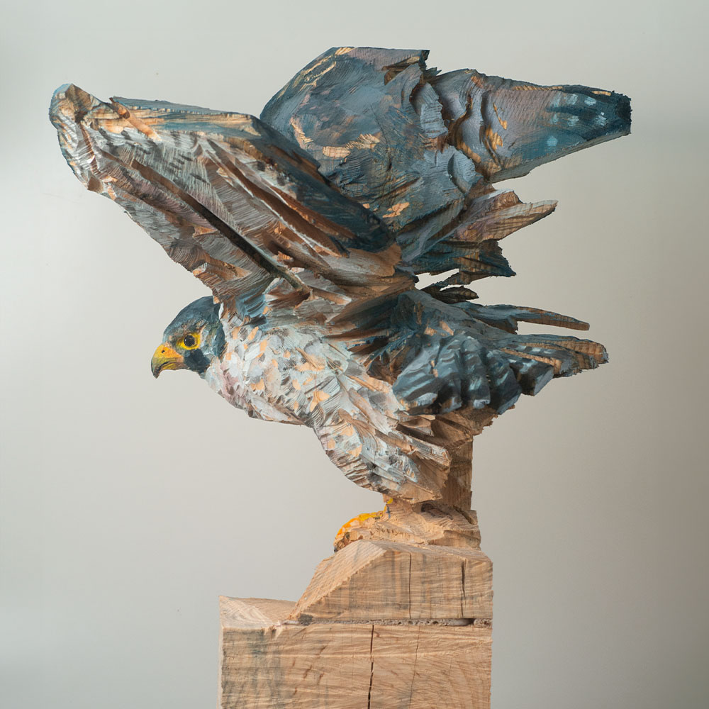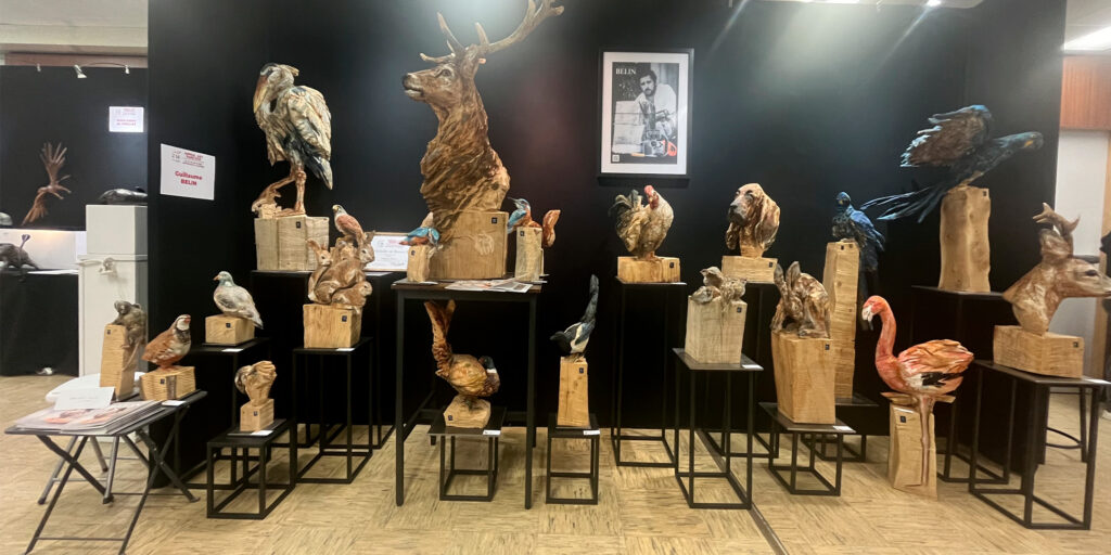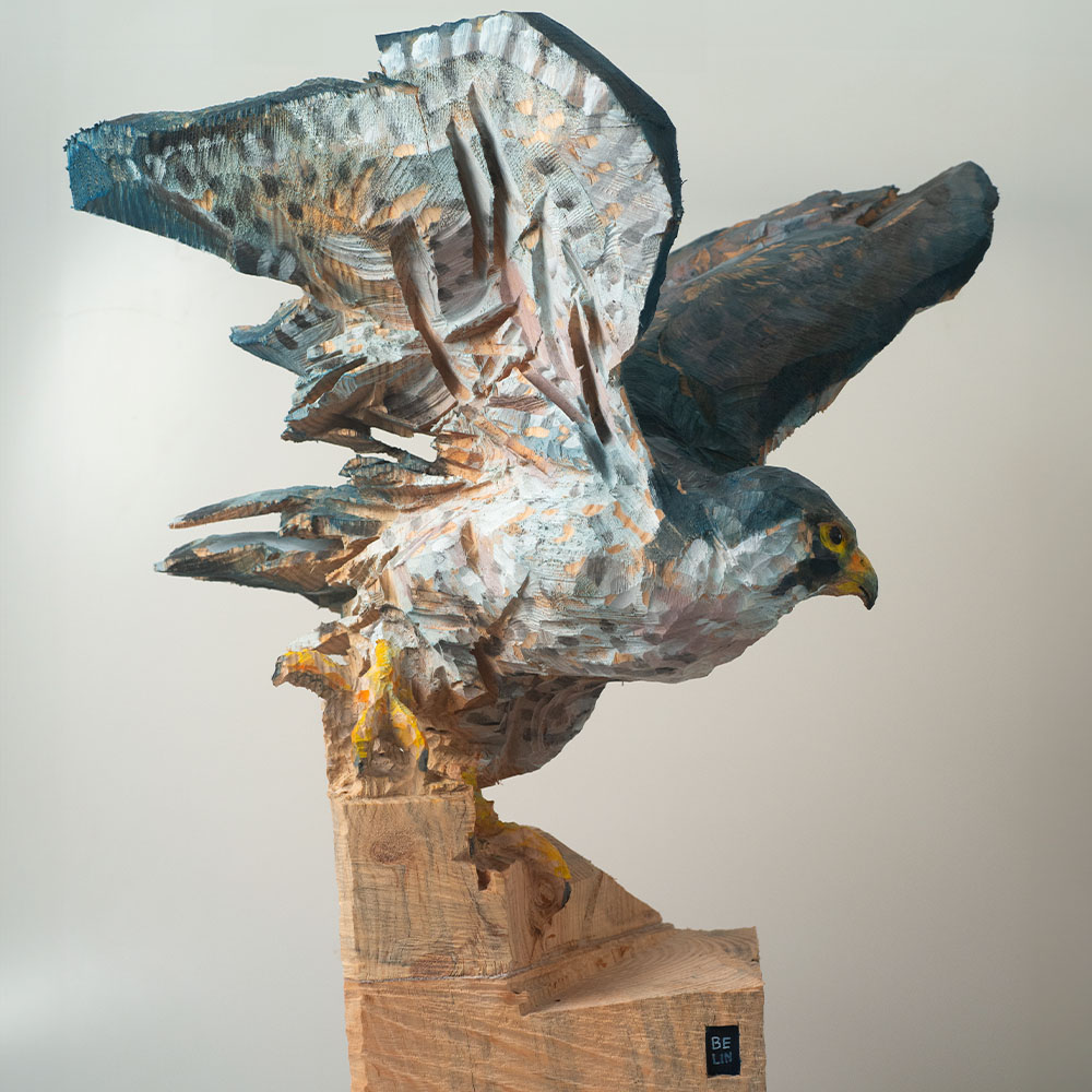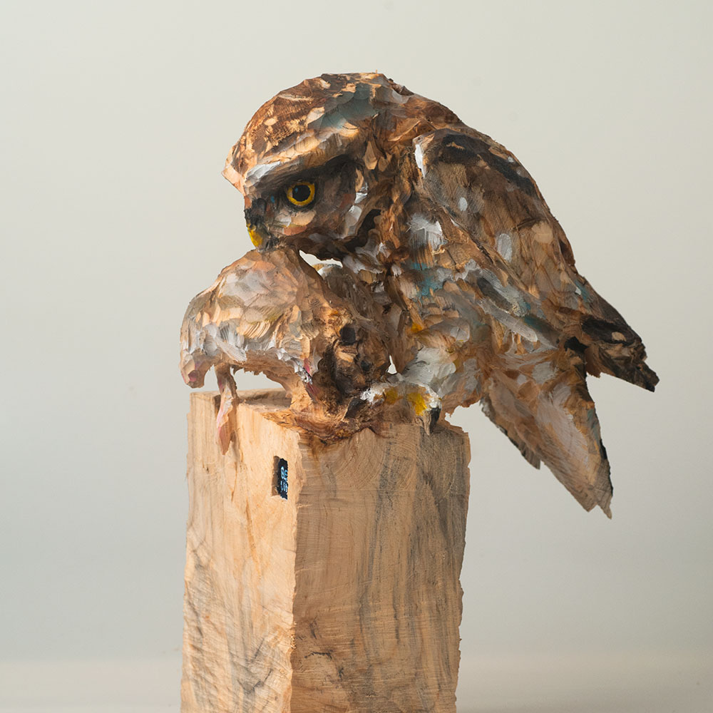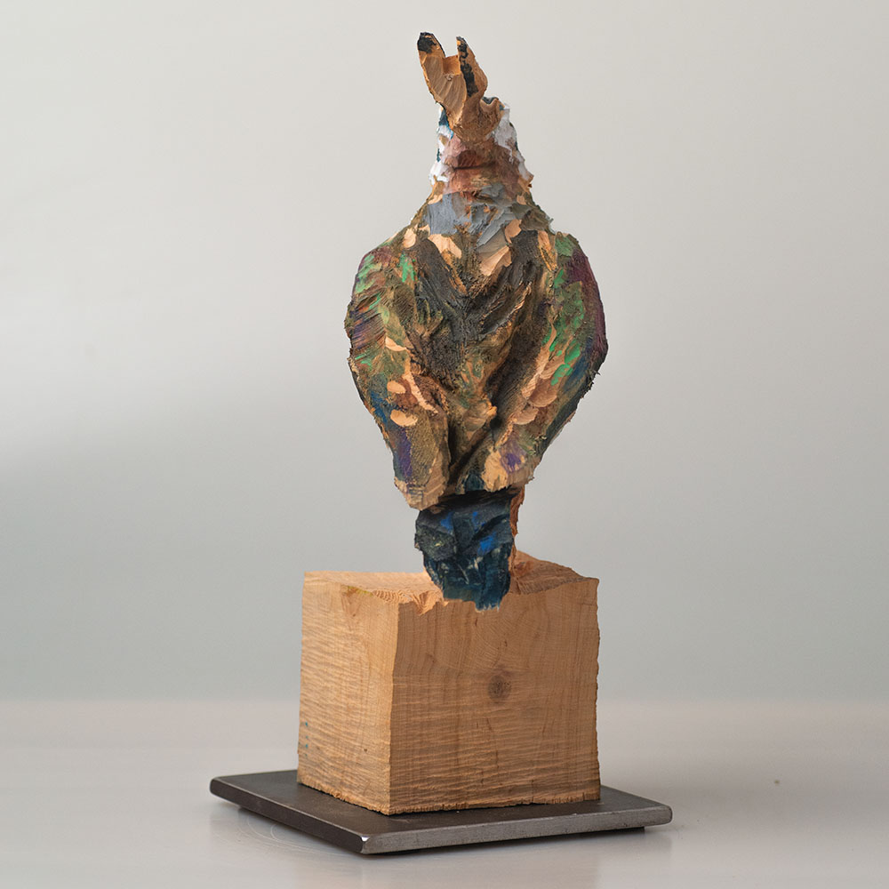 Passionné par la faune depuis toujours, je me suis lancé le défi de sculpter les animaux qui m’entourent, avec l’envie de montrer qu’ils sont tous extraordinaires, même ceux que l’on ne remarque plus. C’est une véritable reconnexion avec mes valeurs et mon environnement. Chaque sculpture est taillée dans un seul bloc de bois. La tronçonneuse, pour moi, est un outil qui permet de capturer l’essentiel, sans s’enliser dans les détails. Cette technique laisse la matière brute, donnant une place à l’imaginaire. Avec mon approche de la peinture, j’utilise des pigments naturels des Ocres du Roussillon pour faire ressortir la vie.