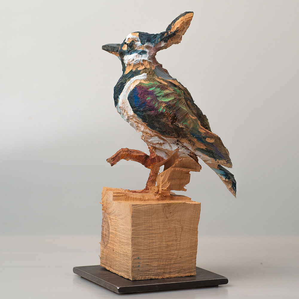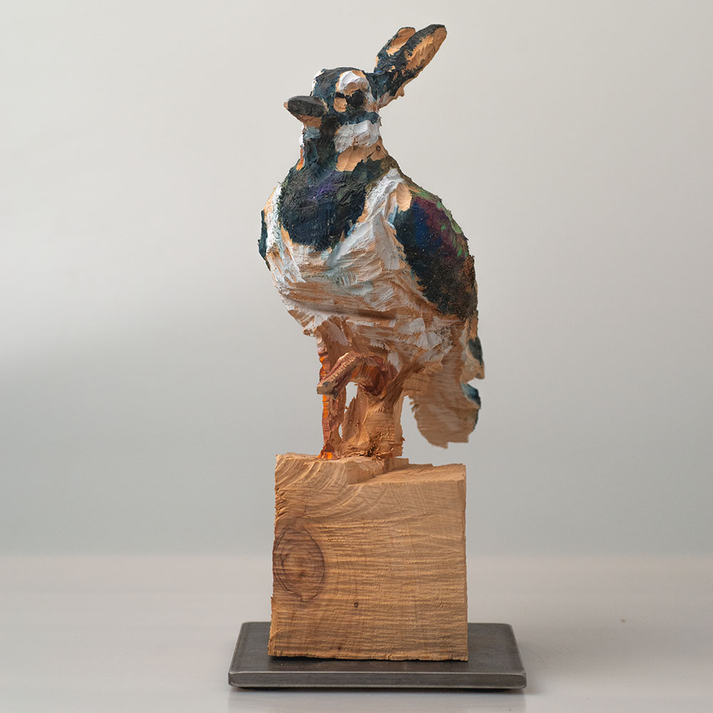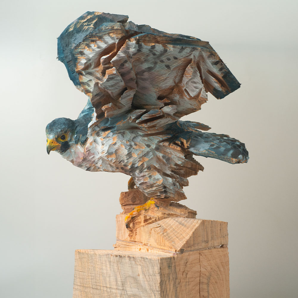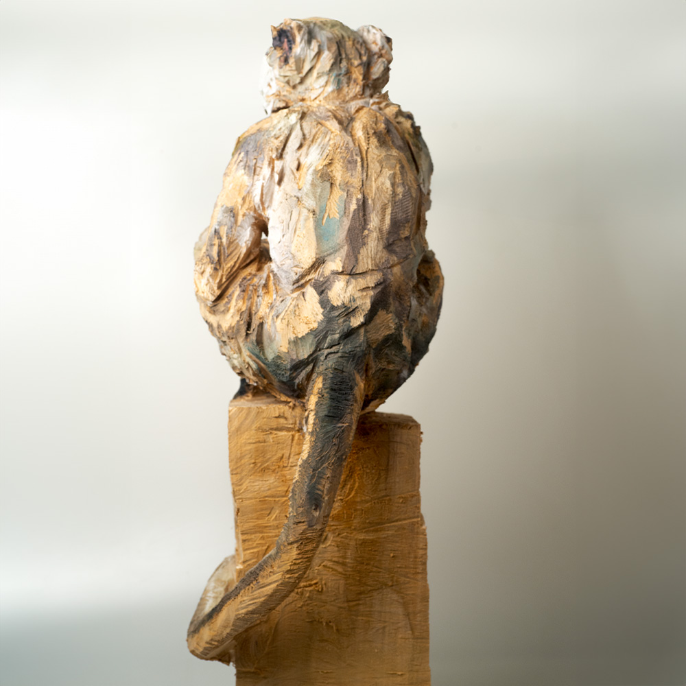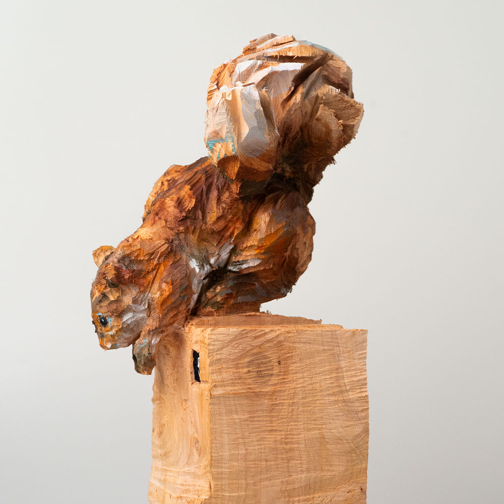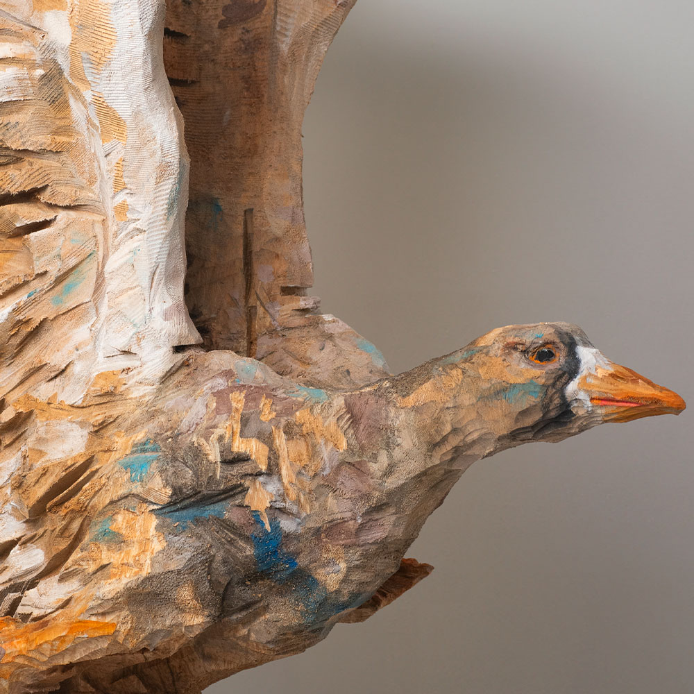 Passionné par la faune depuis toujours, je me suis lancé le défi de sculpter les animaux qui m’entourent, avec l’envie de montrer qu’ils sont tous extraordinaires, même ceux que l’on ne remarque plus. C’est une véritable reconnexion avec mes valeurs et mon environnement. Chaque sculpture est taillée dans un seul bloc de bois. La tronçonneuse, pour moi, est un outil qui permet de capturer l’essentiel, sans s’enliser dans les détails. Cette technique laisse la matière brute, donnant une place à l’imaginaire. Avec mon approche de la peinture, j’utilise des pigments naturels des Ocres du Roussillon pour faire ressortir la vie.